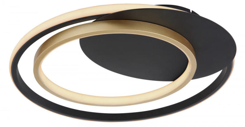 Mennyezeti lámpa fém fekete-arany váz, akril opál búra. Funkciók: memória, éjszakai fény, színhőmérsékletváltós, fényerő-szabályozható. HxSZxM:485x465x61, inkl. 1xLED 36W 230V, 900lm Output, CCT 3.000-6.000, távirányítóval.