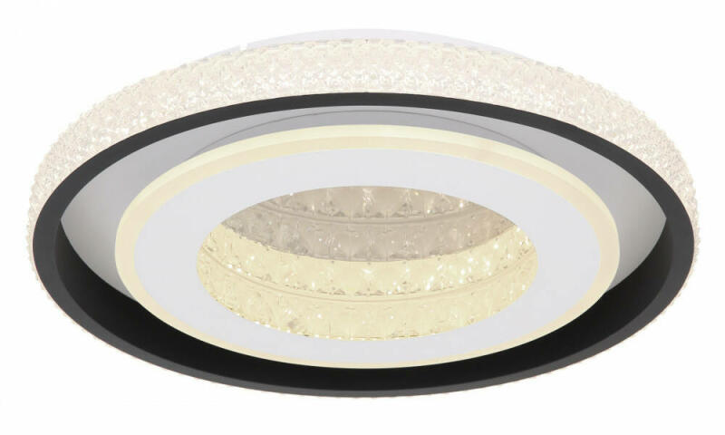 Mennyezeti lámpa fehér fém váz, akril opál búrával, benne akril-kristály dekorral. Funkciók:éjjeli fény, fényerőszabályzó, memória, színhőmérsékletváltós, távirányító. Ø:500, M:80, LED 52W 230V, 2260lm CCT2700-6000