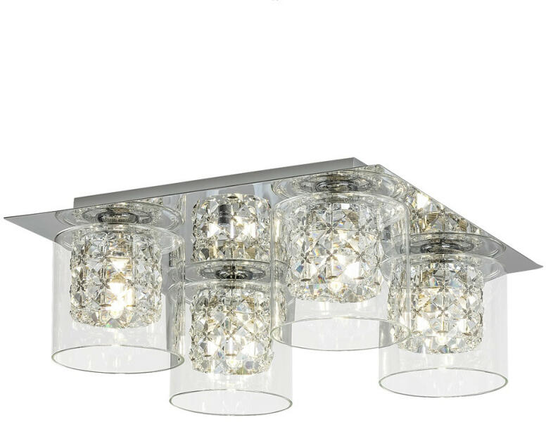 A modern és elegáns Duchess négyes mennyezeti lámpa látványos kiegészítője lehet nappalink, étkezőnk vagy hálószobánk berendezésének. A krómszínű, vasból készült lámpatestet átlátszó, henger alakú üvegbúrák teszik teljessé, amelyek látni engedik a lámpafejek belsejében elhelyezett csodás kristálydekort. Ez a modell nagyméretű, szögletes dísztalp segítségé