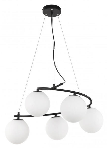 Az indusztriális stílus képviselői közé tartozó Aslan ötös függeszték látványos kiegészítője lehet modern nappalinknak vagy hálószobánknak. A fémből készült, matt fekete lámpatestet fehér üvegbúrák egészítik ki, amelyek úgy függnek a félköríves lámpatesten, mint öt fehér léggömb. A függeszték kisméretű, kerek dísztalp segítségével rögzíthető a men