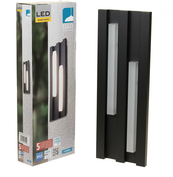 A FANDINA külső LED fali lámpa horganyzott fémházzal rendelkezik fekete színben, két eltolt LED profillal. A fehér műanyag világítópanelek mögött beépített LED-ek kellemes meleg fehér fényt adnak. A fali lámpa por és alacsony nyomású vízsugár elleni IP55-ös védettségének köszönhetően kültéri használatra is alkalmas. Modern és elegáns dizájnjával a termék bár