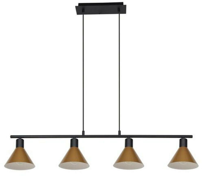 A modern stílusú Alvaro négyes függeszték a lakás számos helyiségébe jó választás lehet: felszerelhetjük a nappaliban, az étkezőben vagy akár a hálószobában. A matt fekete és arany színkombinációban készült fémlámpát lefelé szélesedő, alul nyitott búrák teszik teljessé. A lámpafejek a kábelek segítségével a dísztalphoz rögzített hosszú tartórúdon sorban