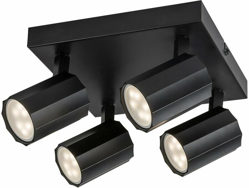 A fémből készült, matt fekete lámpatestet ugyanilyen színű, henger formájú alumínium búrák egészítik ki, és a lámpa négyzet alakú dísztalp segítségével rögzíthető a mennyezetre. A dísztalp négy sarkához rögzített, mozgatható lámpafejek lehetővé teszik a helyiség hatékony bevilágítását. A Rogelio négy darab, egyenként legfeljebb 5 W teljesítményű fényfo
