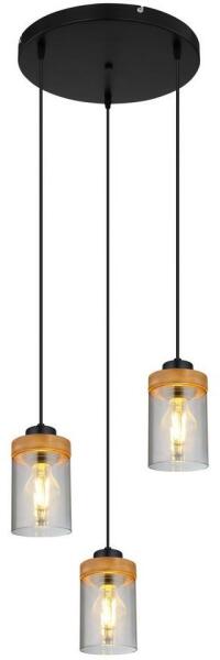 Függeszték fém matt fekete, fa sötétbarna, füstszínű üveg, ø: 390mm, H: 1500mm, fényforrás nélkül szállítva 3x E27 40W 230V