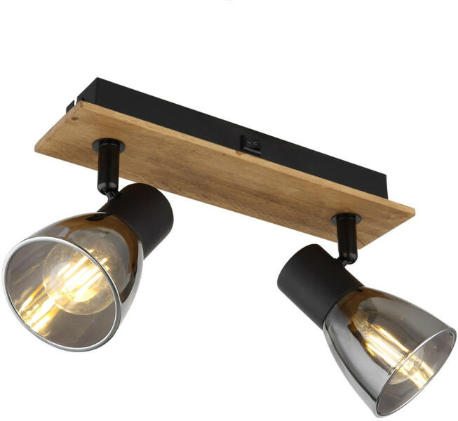 Matt fekete színű fém vázas, fa betétes spot lámpa füstszínű üveg búrával, billenthető fejjel, E14-es foglalattal, lámpatesten kapcsolóval.