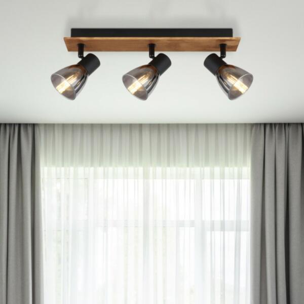 Spotlámpa 40W, E14 foglalat, Jellemző anyag: fa, Jellemző szín: sötétbarna, nem tartalmaz fényforrást, 230V, Méret: 400mm x 70mm x 155mm (Hosszúság x Szélesség x Magasság), 54307-3W Spotlámpa sötétbarna fa, matt fekete fém, füstölt üveg, HxSzxM. : 400x70x155mm, fényforrás nélkül szállítva 3x E14 40W 230V