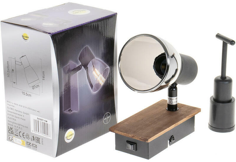 Spotlámpa 40W, E14 foglalat, Jellemző anyag: fa, Jellemző szín: sötétbarna, nem tartalmaz fényforrást, 230V, Méret: 70mm x 140mm (Hosszúság x Szélesség x Magasság), 54307-1W Spotlámpa sötétbarna fa, matt fekete fém, füst színű üveg, billenőkapcsoló a talpra szerelve, SZxH: 70x140mm, AL: 155mm, 1x E14 40W 230V, fényforrás nélkül szállítva