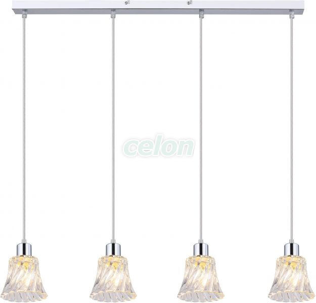 A klasszikus stílusban készült Hestia négyes függeszték nappalink, étkezőnk, esetleg hálószobánk berendezésének elegáns darabja lehet. A krómszínű, fém lámpatestet átlátszó üvegbúrák egészítik ki, a lámpa hosszú, szögletes dísztalp segítségével rögzíthető a mennyezetre. A harang alakú búrák érdekességét hullámzó felületük csavart hatása adja. A függ