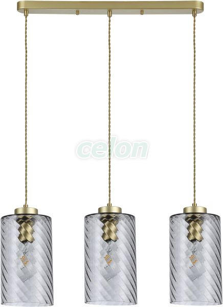 A Sheila hármas függeszték ízléses és elegáns kiegészítője lehet modern nappalink, étkezőnk vagy hálószobánk berendezésének. Az aranyszínű, fém lámpatestet színezett üvegből készült búrák egészítik ki, az egymás mellett, azonos magasságban elhelyezkedő lámpafejeket csavart textil tartókábelek kötik össze az aranyszínű, hosszúkás dísztalppal. A henger alak