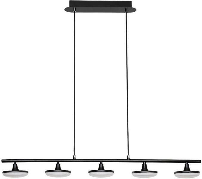 A modern stílusú Madi ötös függeszték jelentős fényerejével és esztétikus megjelenésével remek választás egy tágasabb nappaliba vagy étkezőbe. A fémből készült, matt fekete lámpatestet fehér műanyagbúrák egészítik ki, és a lámpa hosszúkás, lekerekített dísztalp segítségével rögzíthető a mennyezetre. Az öt kerek, tányérszerű lámpafej a tartókábelhez k