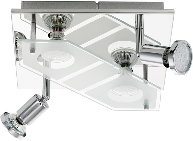 Rövid ismertető Ezt a Pertini mennyezeti lámpát az Eglo gyártja. A lámpa alapja króm színű acél, a rajta található fénypontok burája áttetsző színű műanyag. A lámpa mérete 450 x 450 mm, teljes magassága 125 mm. Súlya közel 2 kg. A lámpában beépített LED fényforrás található. A LED modulok egyenként 5W teljesítményűek (összesen 20W), fényárama összesen 2320 l