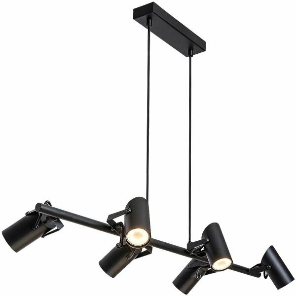 A teljes egészében fémből készült matt fekete modellt henger alakú búrák egészítik ki, és hosszúkás, téglalap alakú dísztalp segítségével rögzíthető a mennyezetre. A mozgatható lámpafejek a tartókábelekkel a dísztalphoz kapcsolódó hosszú, vízszintes rúd két oldalán helyezkednek el, és fényüket tetszés szerint irányíthatjuk. A lámpa hat darab, egyenként le