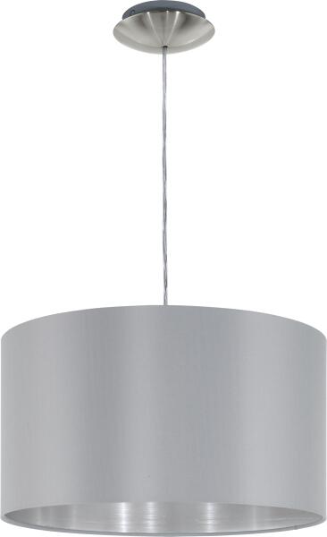 Ezt a Maserlo függesztett lámpát az Eglo gyártja. Kívül szürke, belül ezüst textil burája 380 mm átmérőjű, a maximális belógása pedig 1100 mm. A belógás magasságát te állíthatod: ha magasabbra szeretnéd húzni, a felesleges kábelmennyiséget tekerd a mennyezethez csatlakozó pogácsába. Súlya közel másfél kg. A lámpa egy fényponttal rendelkezik, foglalata E27 (max.