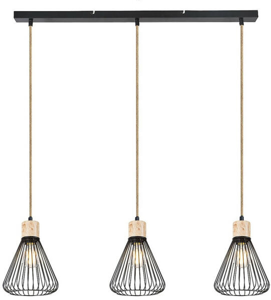 RÁBALUX Farfalle, beltéri függeszték, E27, 3xMAX40W, D18cm, bükk/fekete (3149) Az indusztriális stílusú Farfalle hármas függeszték modern nappalink vagy hálószobánk berendezésének puritán darabja lehet. A fémből és fából készült modell jellegzetességét a lefelé szélesedő, harang alakú rácsos búrák és a lámpafejek színéhez igazodó kötélkábelek adják. A hár