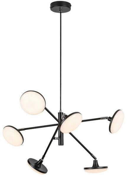 A modern stílusú Madi hatos függeszték jelentős fényerejével és esztétikus megjelenésével remek választás egy tágasabb nappaliba vagy étkezőbe. A fémből készült, matt fekete lámpatestet fehér műanyagbúrák egészítik ki, és a lámpa kisméretű, kerek dísztalp segítségével rögzíthető a mennyezetre. A hat darab billenthető lámpafej a tartókábelhez kapcsolódó h