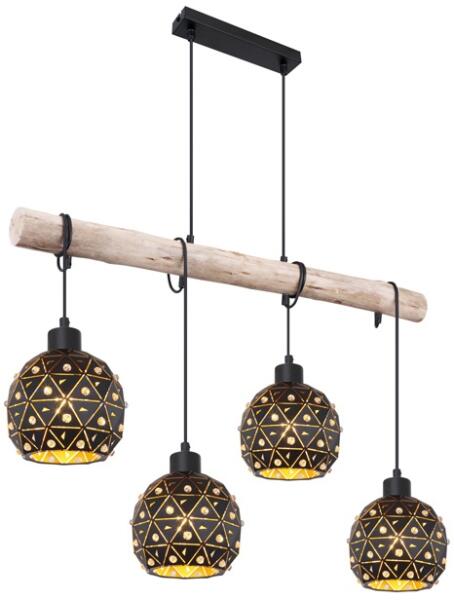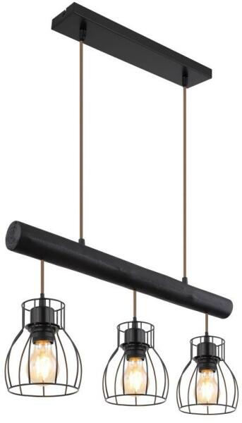 Függeszték fém matt fekete váz, égetett fa gerendával, fém fekete drót búrával, textilkábellel. HxSzxM: 600x136x1400, fényforrás nélkül 3xE27 60W 230V
