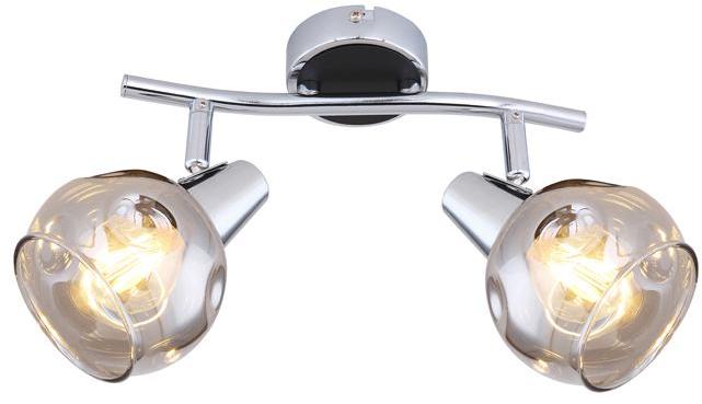 Rábalux Tamara mennyezeti lámpa - A lámpatest krómszínű fémből készült, és színezett üvegbúrák kapcsolódnak hozzá. A lámpa könnyen a mennyezetre rögzíthető egy kerek dísztalp segítségével. A krómszínű dísztalpot fekete előlap borítja, míg a két lámpafej vízszintes tartórúdon helyezkedik el, amely a dísztalp része. A gömbölyded, alul nyitott búrák színez