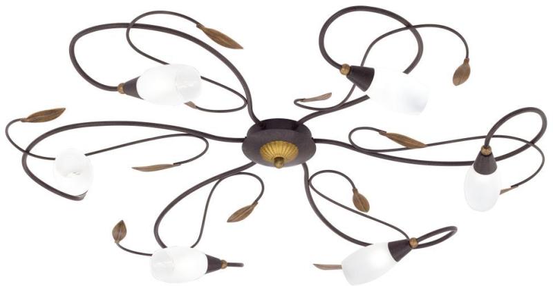Rövid ismertető Ezt a Gerbera 1 mennyezeti lámpát az Eglo gyártja. Maga a lámpa egy virágkompozíciót formál meg: a virágok feje a fehér szatinált üveg bura, szárai az antik barna színű acél elemek, amelyeket indaszerűen hajlítottak meg. A szárakról arany színű indás levelek futnak ki. Átmérője 780 mm, teljes magassága 90 mm. Súlya közel 4 kg. A lámpa hat fénypontta