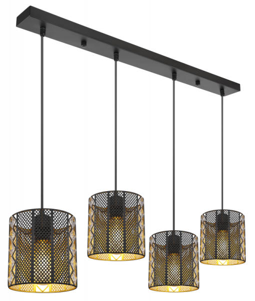 Függeszték fekete fém váz, fekete-arany fém búrák, akril -kristály dekorral . HxSZxM:800x165x1200, exkl. 4xE27 60W 230V