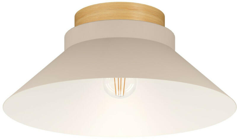 Barna színű fém és fa vázas kerek mennyezeti lámpa homok színű fém búrával, E27-es foglalattal.