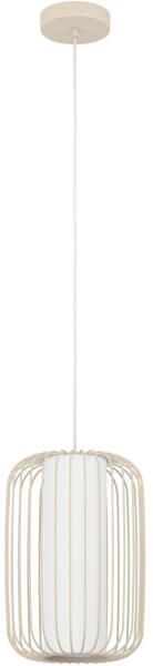 Homok színű fém vázas függeszték homok-fehér színű fém és textil búrával, E27-es foglalattal.