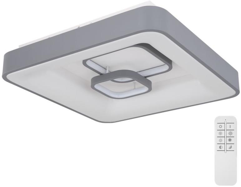 Mennyezeti lámpa alaplap, akril fehér-szürke búrával. Funkciók: memória, éjszakai fény, színhőmérsékletváltós, fényerő-szabályozható, távirányítóval. HxSZxM:500x500x100, inkl. 1xLED 50W 230V, 1900lm, CCT 3.000-6.000