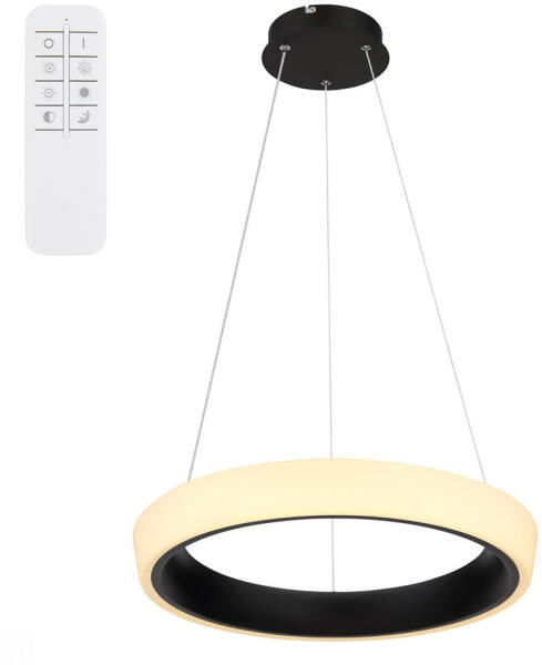 Modern kerek csillár. Beltérre alkalmas. Tartalmazza a távirányítót (2xAAA elemekkel). Ezzel a távirányítóval kiválaszthatja a fényhőmérsékletet és a fényerőt. A lámpa rendelkezik éjszakai fény funkcióval és memória funkcióval, amely lehetővé teszi az utoljára használt beállítások elmentését. Beépített energiatakarékos LED-es tápegység. Ez a termék E-osztál