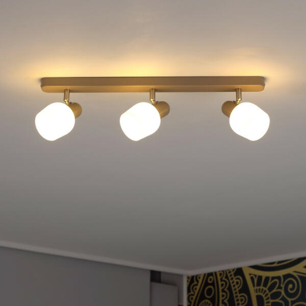 Homok színű fém vázas mennyezeti spot lámpa fehér színű üveg búrával, E14-es foglalattal. A lámpa egyéb tulajdonsága(i): állítható fejű lámpa.
