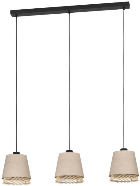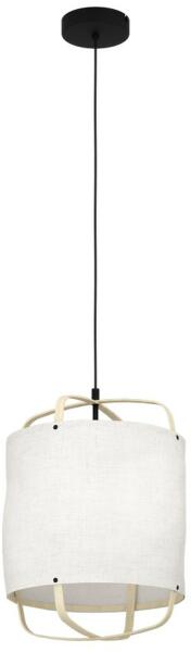 Naturális stílusú, fekete színű fém vázas függeszték natúr-barna színű textil és fa búrával, E27-es foglalattal.