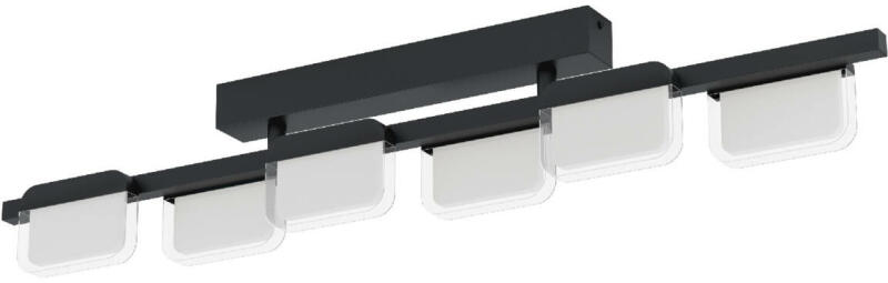 Az ERVIDEL LED mennyezeti lámpa fekete fém talppal rendelkezik, amely egy hosszú, azonos színű fém tartóra van rögzítve. Ennek a kialakításnak hat szatén akril lámpája van, amelyek különböző oldalakon helyezkednek el. Az integrált LED-ek kellemes meleg fehér fényt bocsátanak ki, amely a falon lévő koordináló forgó dimmerrel szabályozható. A minimalista mennyezeti lámp