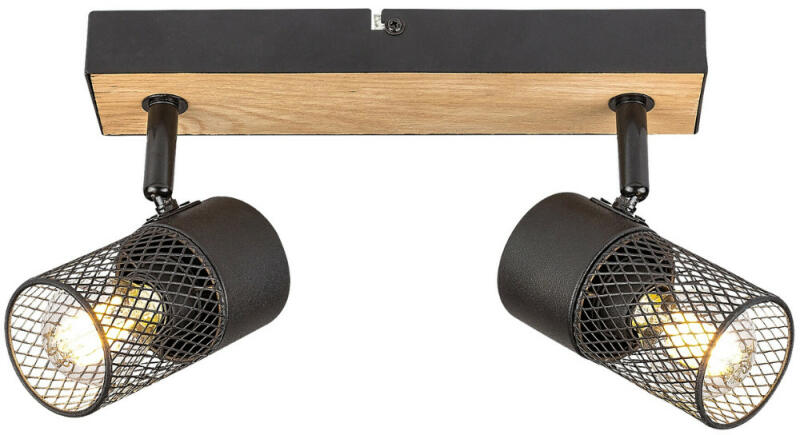 RÁBALUX Metta beltéri mennyezeti lámpa E14 2xMAX40W, tölgy/fekete, L28cm (71152) Az indusztriális stílusú Metta kettes mennyezeti spotlámpát elsősorban a nappaliba vagy a hálószobába ajánljuk. A tölgyszínű, fémből és fából készült modellt fekete, henger alakú, alul nyitott rácsos búrák egészítik ki, és hosszúkás, téglalap alakú dísztalp segítségével rögzíth
