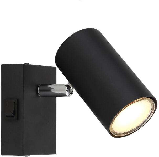 Fekete színű fém spot lámpa króm elemkkel, billenthető fejjel, GU10-es foglalattal, lámpatesten lévő kapcsolóval. A lámpa fényforrást nem tartalmaz.