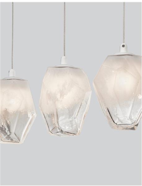 Átlátszó-fehér üvegbúrás függeszték, mely a jég formáját és színvilágát idézi. Magasság adatnál a maximális belógást adtuk meg, mely a vezeték rövidítésével csökkenthető. LED fényforrással működtethető, melyet a csomagolás nem tartalmaz. Specifikációk:Gyártó: Nova Luce Cikkszám:: NL-9260235 Foglalat: 5 x G9 Méret (ma x sz x mé): 1800 x 840 x 120 mm IP-véd