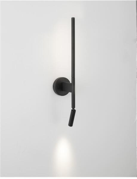 Matt fekete, modern stílusú olvasókaros fali lámpa. A lámpa színhőmérséklete 3000 Kelvin, azaz meleg fehér beépített LED fényforrást tartalmaz, mely nem cserélhető. A lámpa fenti karjának 310, olvasókarjának 210 Lumen a fényereje. A karok forgathatóak, így fényük a kívánt helyre irányítható. Billenőkapcsolói a fali konzolon találhatók. Specifikációk:Gyártó: No