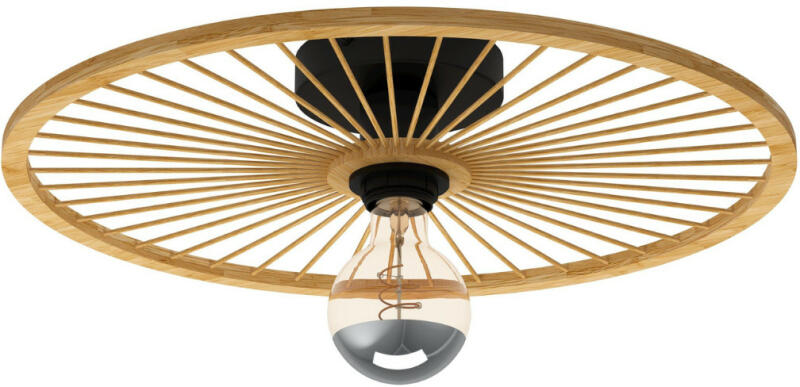 Naturális stílusú, fekete színű fém vázas kerek falra vagy mennyezetre egyaránt szerelhető lámpa natúr színű fa búrával, E27-es foglalattal.