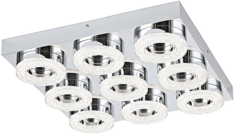 Rövid ismertető Ezt a Fradelo kilenc fénypontos mennyezeti lámpát az Eglo gyártja. Egy 440 x 440 mm króm színű acél alapon helyezkedik el kilenc darab 4Wteljesítményű, kör alakú LED modul, aminek előlapja króm kristály. A lámpa mennyezettől 70 mm-re áll el. Súlya alig több, mint 3 kg. A lámpában beépített LED fényforrás található, amelynek teljesítménye összesen 3