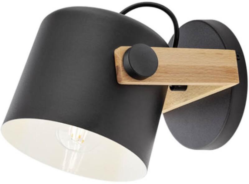 Fekete színű fém és tölgyfa vázas fali lámpa belül fehér színű fém billenthető búrával, E27-es foglalattal.