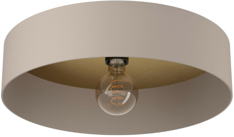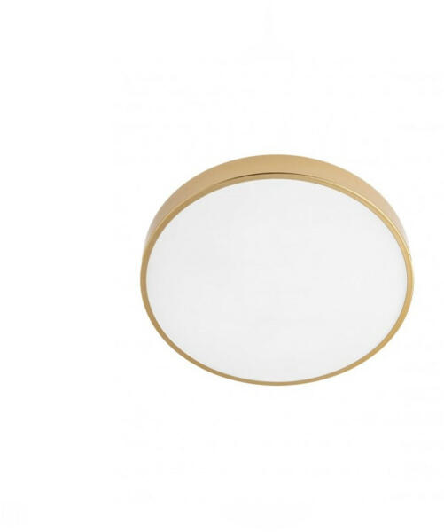 Matt arany színű fém vázas mennyezeti lámpa opálos akril búrával, 36W beépített LED fényforrással. A lámpa színhőmérséklete fali kapcsoló segítségével 3000-6500K között állítható.