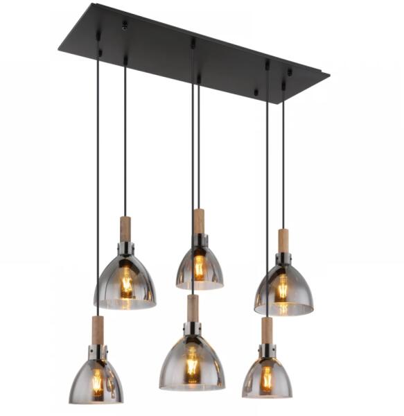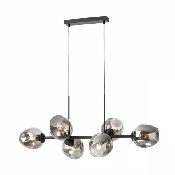 Matt fekete színű fém vázas függeszték lámpa áttetsző, füstszínű fúvott üveg búrákkal, E27-es foglalattal. Filament Led fényforrással mutat a legjobban, ami nem tartozék.