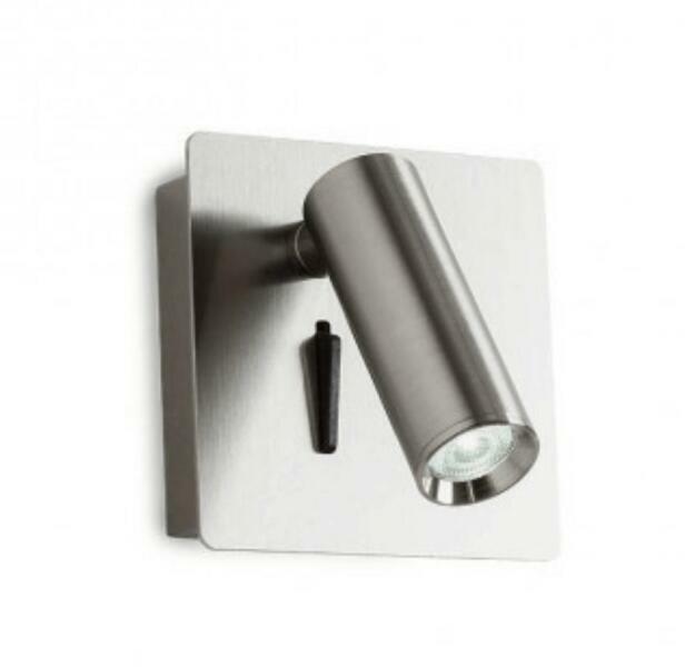 Matt nikkel színre festett fém falikar állítható fejjel, beépített LED fényforrással és a lámpatesten kapcsolóval.