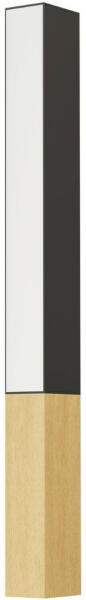 Fekete-barna színű fém és fa vázas szögletes fali lámpa fehér színű műanyag búrával, meleg fehér színhőmérsékletű beépített led fényforrással.