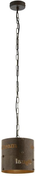 Rövid ismertető Ezt a vintage stílusú Coldingham függesztett lámpát az Eglo gyártja. Kívül rozsda, belül bronz színű acél burájából különböző feliratokat vágtak ki. A feliratoknál áttetszik a bronz burabelső. Átmérője 200 mm, a maximális belógása pedig 1100 mm. A belógás magasságát te állíthatod: ha magasabbra szeretnéd húzni, a felesleges kábelmennyiséget