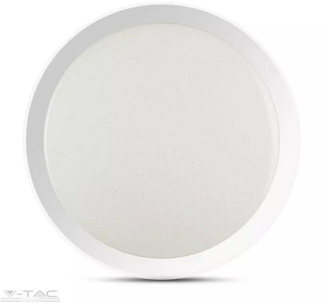 V-TAC Mennyezeti DESIGN, CCT LED lámpa, távirányítóval A mennyezetre szerelhető LED lámpatest színhőmérséklete változtatható (CCT), teljesítménye 60 Watt (30+30 Watt), valamint búrájának felülete csillogó hatású. A lámpatest különlegessége, hogy a fehér színű búra felületén apró "lyukak" találhatóak elszórtan, így különböző szögből nézve csillogás láth