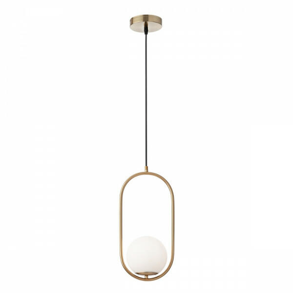 Matt arany színű fém vázas függeszték lámpa gömb alakú, opál üveg búrával, E14-es foglalattal. A lámpa fényforrást nem tartalmaz.