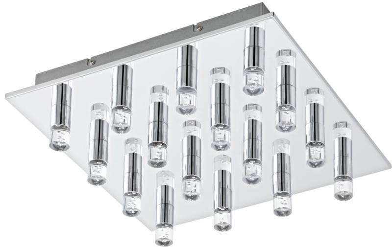 Gyártó: EGLO Modell: TEOCELO 95363 Leírás: Ezt a Teocelo tizenhat fénypontos mennyezeti lámpát az Eglo gyártja. Egy 370 x 370 mm króm színű acél alapon helyezkedik el 16 darab 1.1W teljesítményű, ovális LED modul, aminek előlapja áttetsző műanyag. A fénypontok az alap króm felületén visszatükröződnek. A lámpa mennyezettől 95 mm-re áll el. Súlya közel 3 és fél kg.