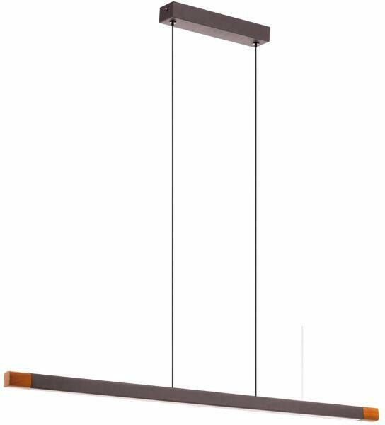 LISCIANA függesztett lámpa felfüggesztett alumínium profillal rendelkezik, sötétbarna színben, gumifa díszítéssel, diófa bevonattal. A lámpa modern megjelenését fekete textil kábelek és fém tető egészíti ki. A matt fehér műanyag világítópanel mögött beépí. .