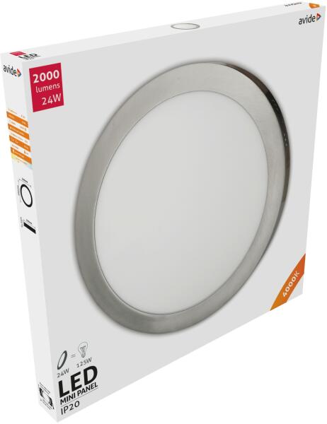 Avide LED Falra Szerelhető Kerek LED panel ALU Szatén Nikkel 24W NW 4000K Az Avide falra szerelhető mennyezeti lámpa felületre szerelhető, egyszerű módon rögzíthető. Előnyük, hogy szereléskor nem szükséges lyukat vágni a mennyezetbe. A ház anyaga alumínium, a diffúzor szintetikus fehér műanyag. A diffúzornak köszönhetően homogén, egyenletes fényeloszlás jellemzi, ezál