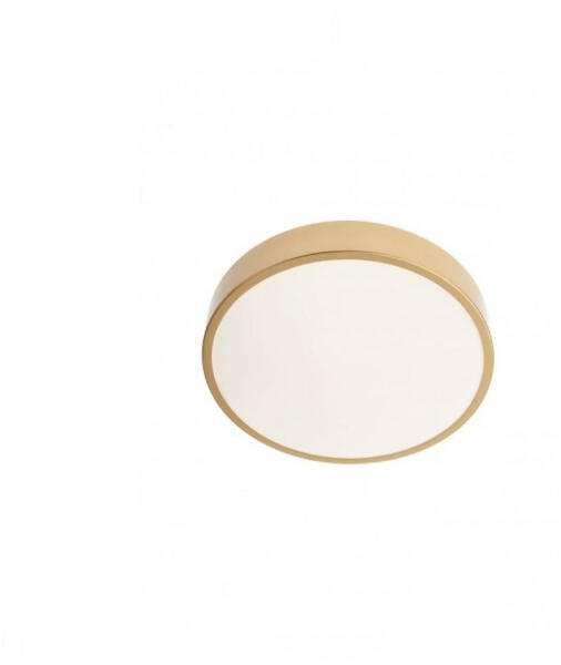 Matt arany színű fém vázas mennyezeti lámpa opálos akril búrával, 24W beépített LED fényforrással. A lámpa színhőmérséklete fali kapcsoló segítségével 3000-6500K között állítható.