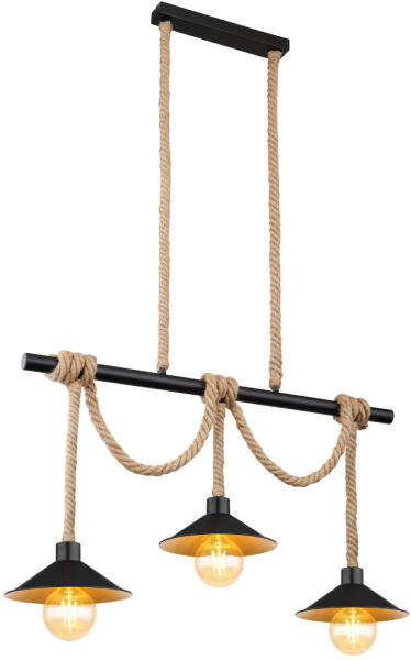 Függeszték 60W, E27 foglalat, Jellemző anyag: fém, nem tartalmaz fényforrást, 230V, Méret: 825mm x 220mm x 1200mm (Hosszúság x Szélesség x Magasság), 15690-3H Függesztett lámpa fém fekete, kender, fém fekete, arany színű, HxSzxM: 825x220x1200mm, fényforrás nélkül szállítva 3x E27 60W 230V