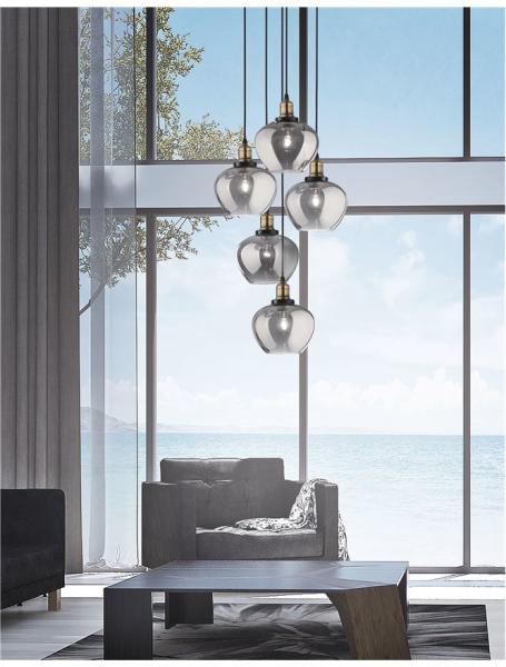 Füstszínű, üveg búrás design függeszték, bronz és feketére festett fém résszel. Halogén, energiatakarékos és LED fényforrással is üzemeltethető, mely nem tartozék. A magasság adatánál a maximális belógást adtuk meg, mely a huzal szabályozásával rövidíthető. Specifikációk:Gyártó: Nova Luce Cikkszám:: NL-8436406 Foglalat: 5 x E27 Méret (ma x sz x mé): 1600 x 50